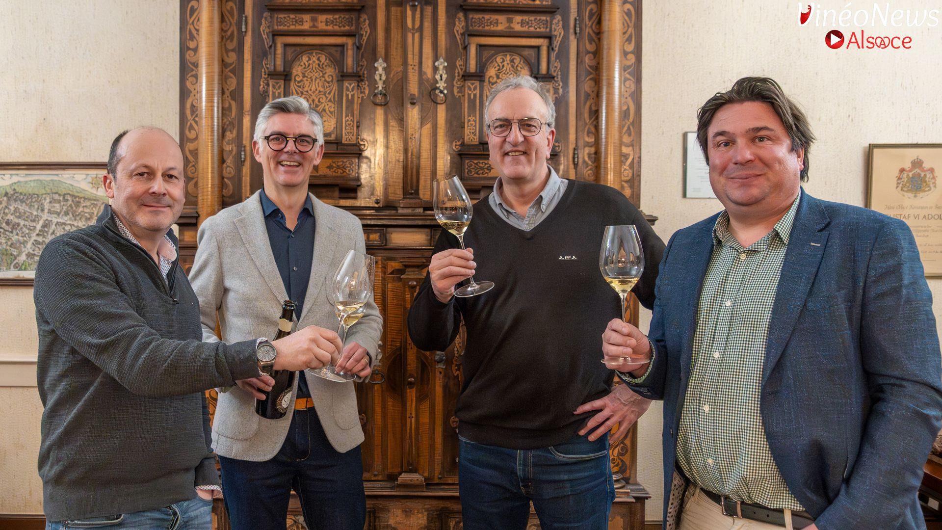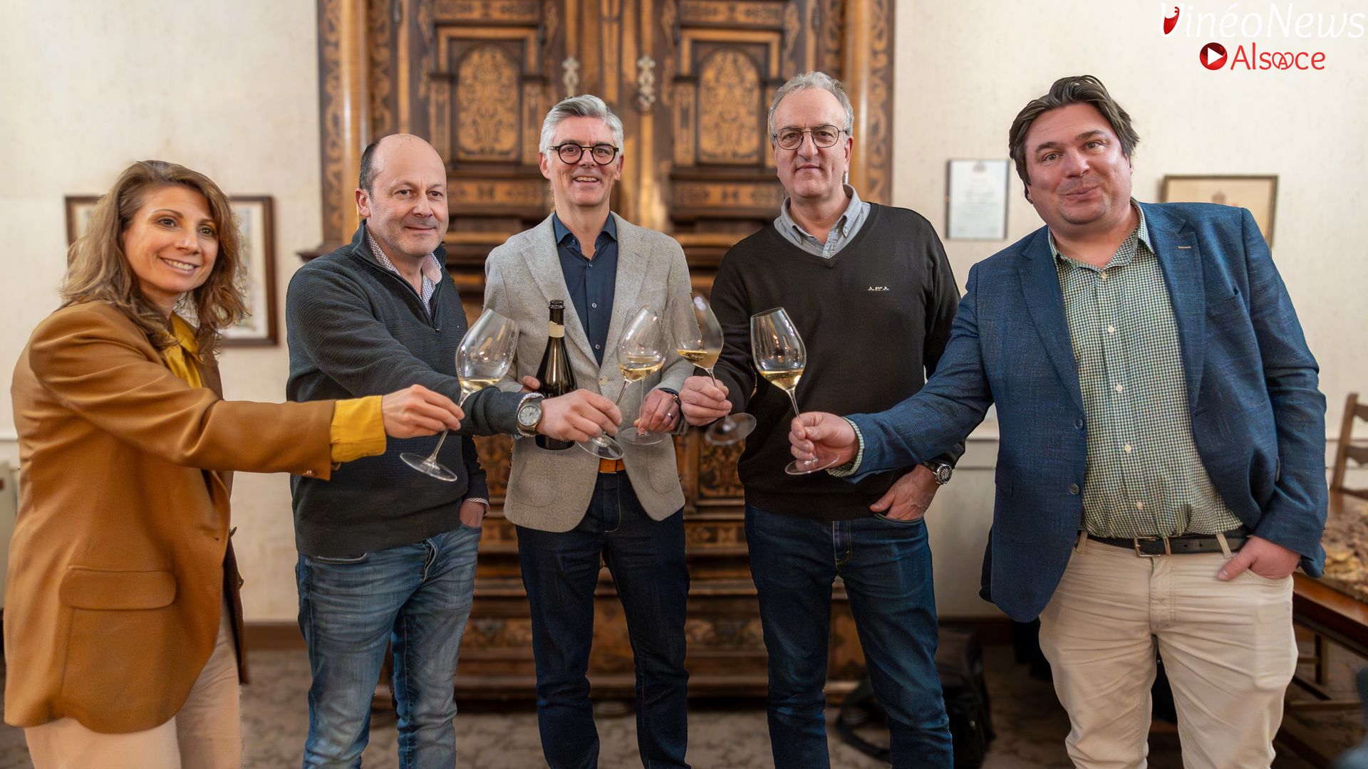Autour de la table figuraient plusieurs figures clés du syndicat : Thomas Boeckel (président), Jacques Cattin (vice-président), Jean-Baptiste Adam (trésorier), Étienne-Arnaud Dopff, membre des GMA et hôte de la rencontre, ainsi que Marie-Paule Gilardoni, directrice des Grandes Maisons d’Alsace.